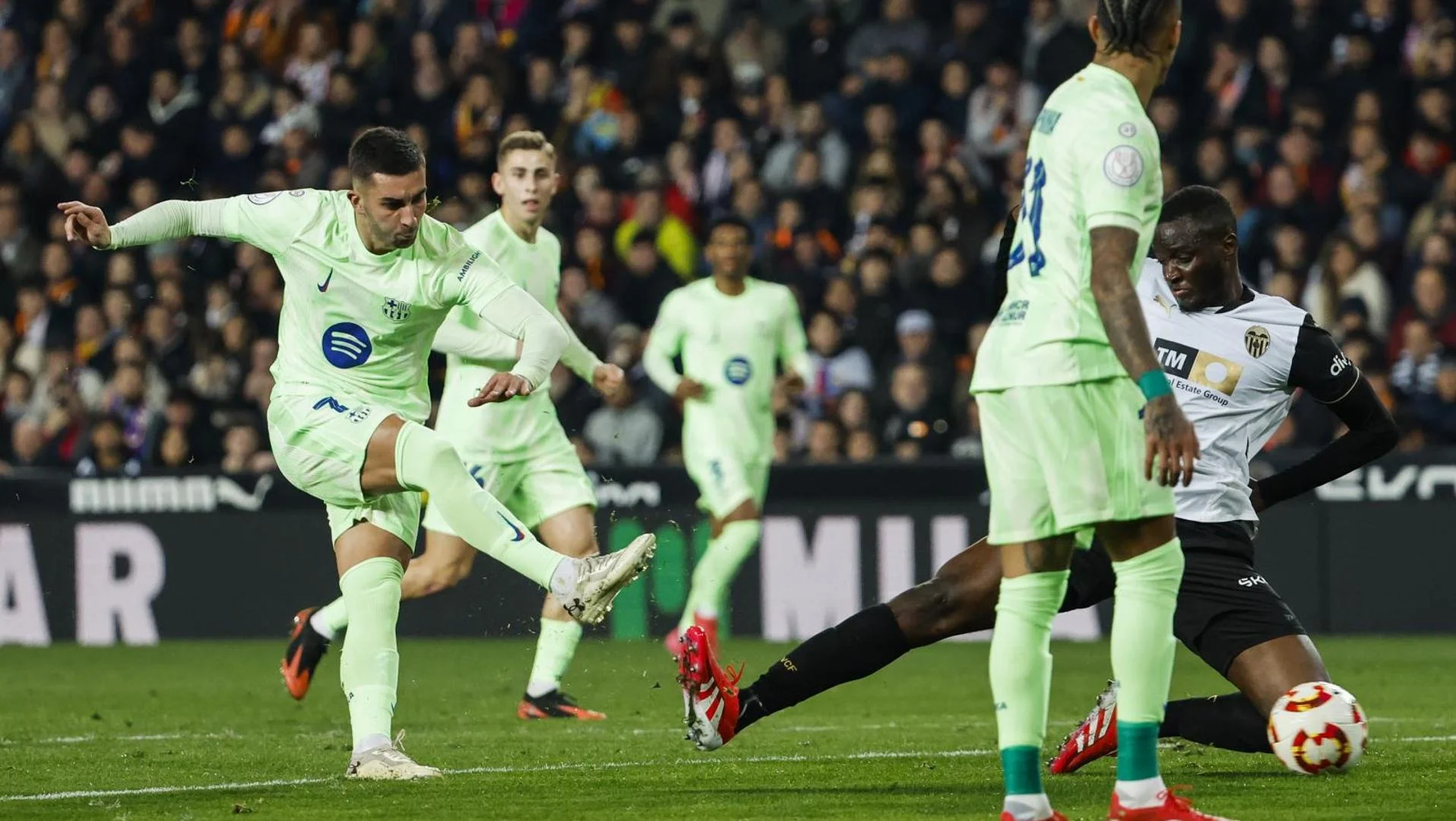 El comienzo fue calcado al del partido de liga. El Barcelona se adelantó en el minuto tres de partido, y antes de la media hora el marcador reflejaba el 0-4 a favor de los de Flick. Esto dió lugar a que cientos de aficionados abandonaran Mestalla antes de la finalización del primer tiempo. Puede que alguna vez hayan escuchado eso de que nunca existen dos partidos iguales, pero esta puede ser la excepción. Tanto en Barcelona como en Valencia los de Flick solo tardaron tres minutos en abrir el marcador. Mientras que por el minuto treinta ya ganaban por cuatro goles de diferencia en ambos escenarios. Goleada que en esta ocasión tuvo el sello de Ferrán Torres, autor de un hat-trick en la primera parte contra el equipo que le vió crecer.