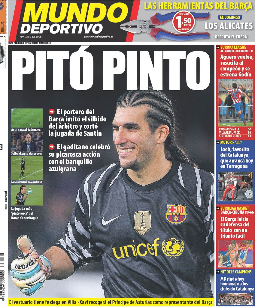 El encuentro disputado en el Camp Nou (2-0) allá por el 20 de octubre de 2010 brindó una imagen tan curiosa como anecdótica. Corría el minuto 26 en el electrónico cuando César Santin, atacante brasileño del Copenhague, enfilaba el arco del equipo culé con verticalidad. De pronto, se paró. Pensó haber escuchado un pitido del colegiado Stéphane Lannoy. No obstante, fue José Manuel Pinto quien realmente silbó para despistar a su rival. Finalmente, el portero gaditano fue sancionado con dos encuentros por engañar a su contrincante.
